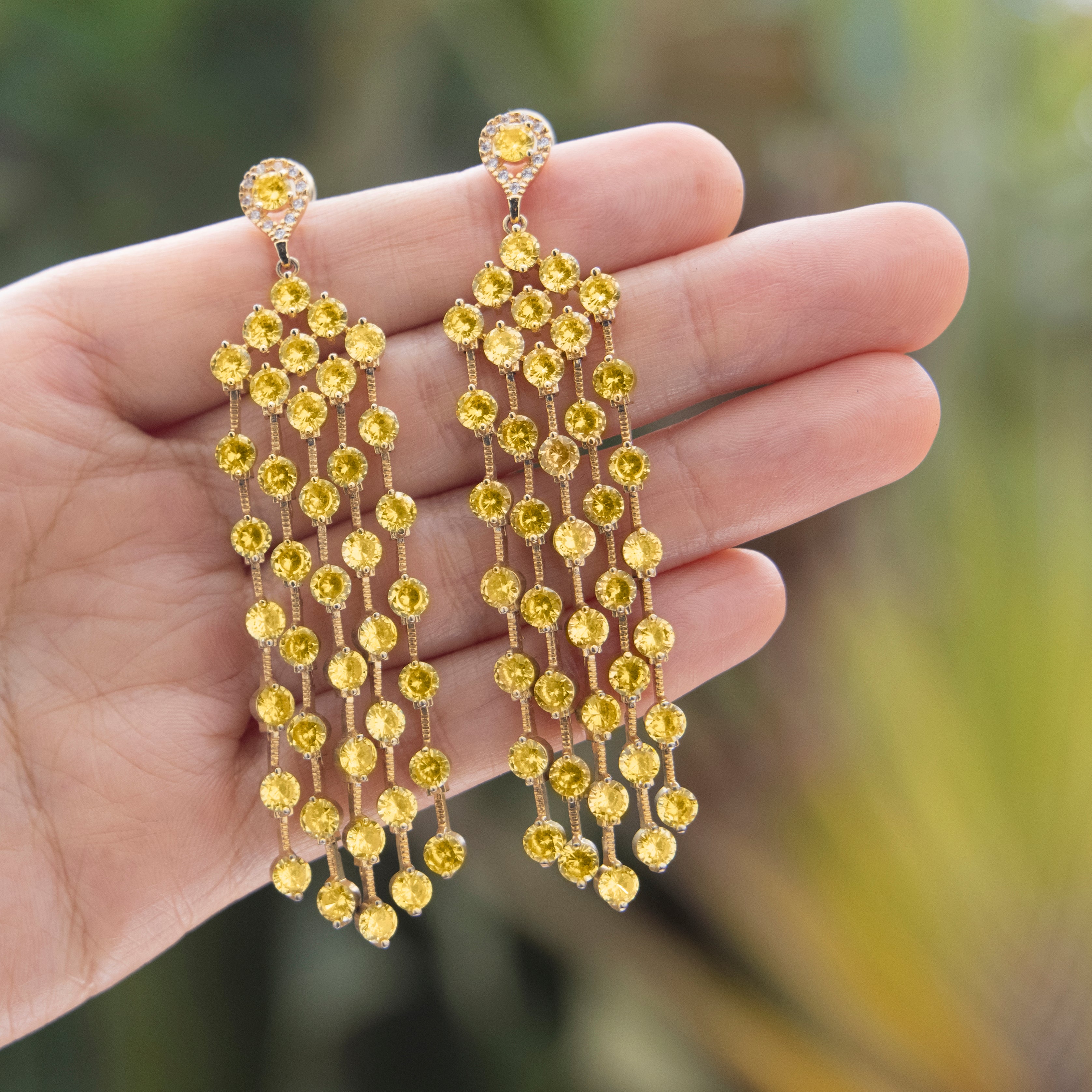 Brilla como el sol con estos deslumbrantes aretes de cascada de Lavanda. Con zirconias redondas en tonos amarillo brillante, montadas en chapa de oro de 14k, estos aretes añadirán un toque radiante y sofisticado a tu look. Su diseño elegante y su caída delicada te harán destacar en cualquier ocasión especial. Una joya imprescindible para brillar con estilo. Descubre el resplandor y la elegancia de Lavanda en cada detalle.