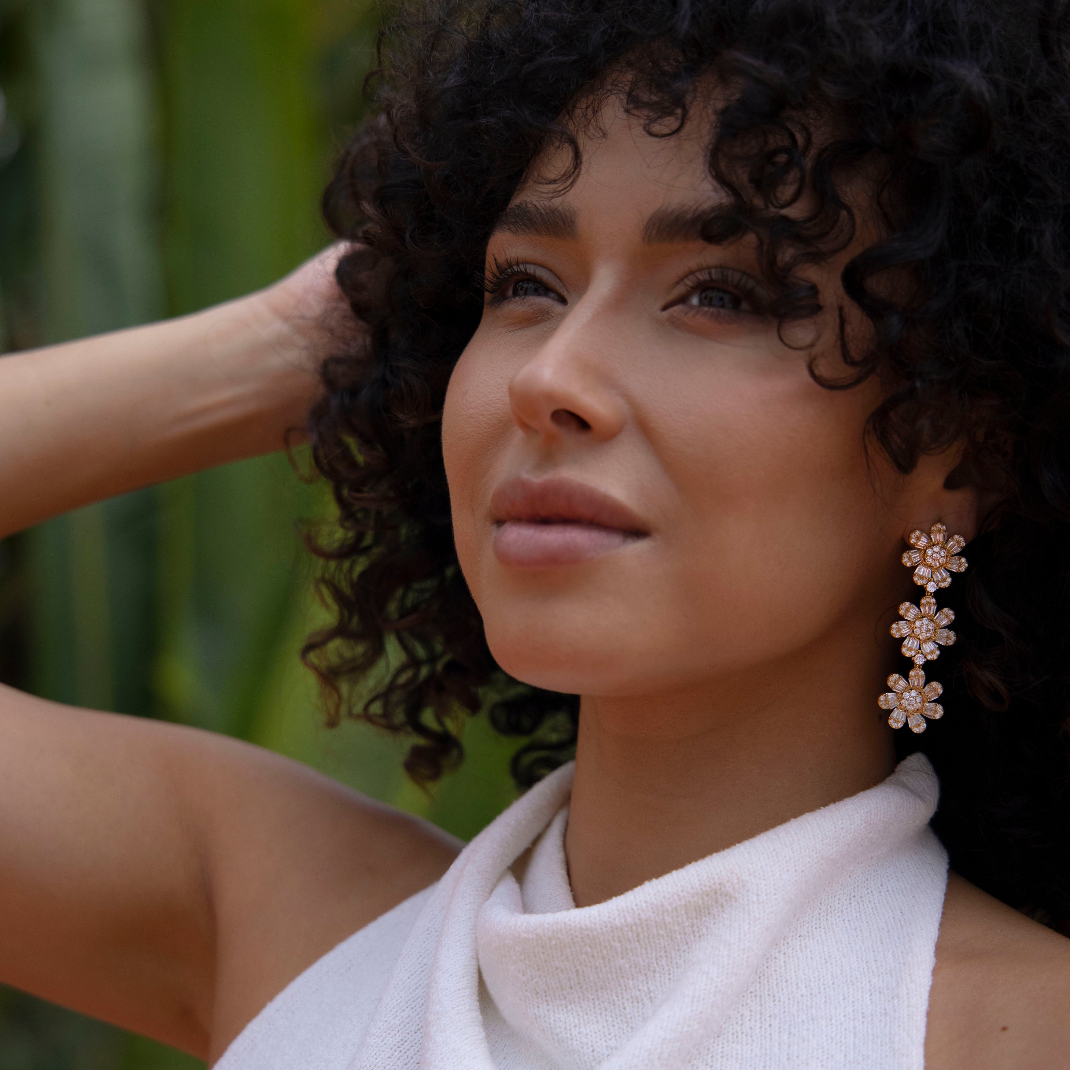 Aretes largos de 3 flores dorado - chapa de oro 14k