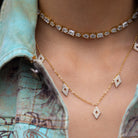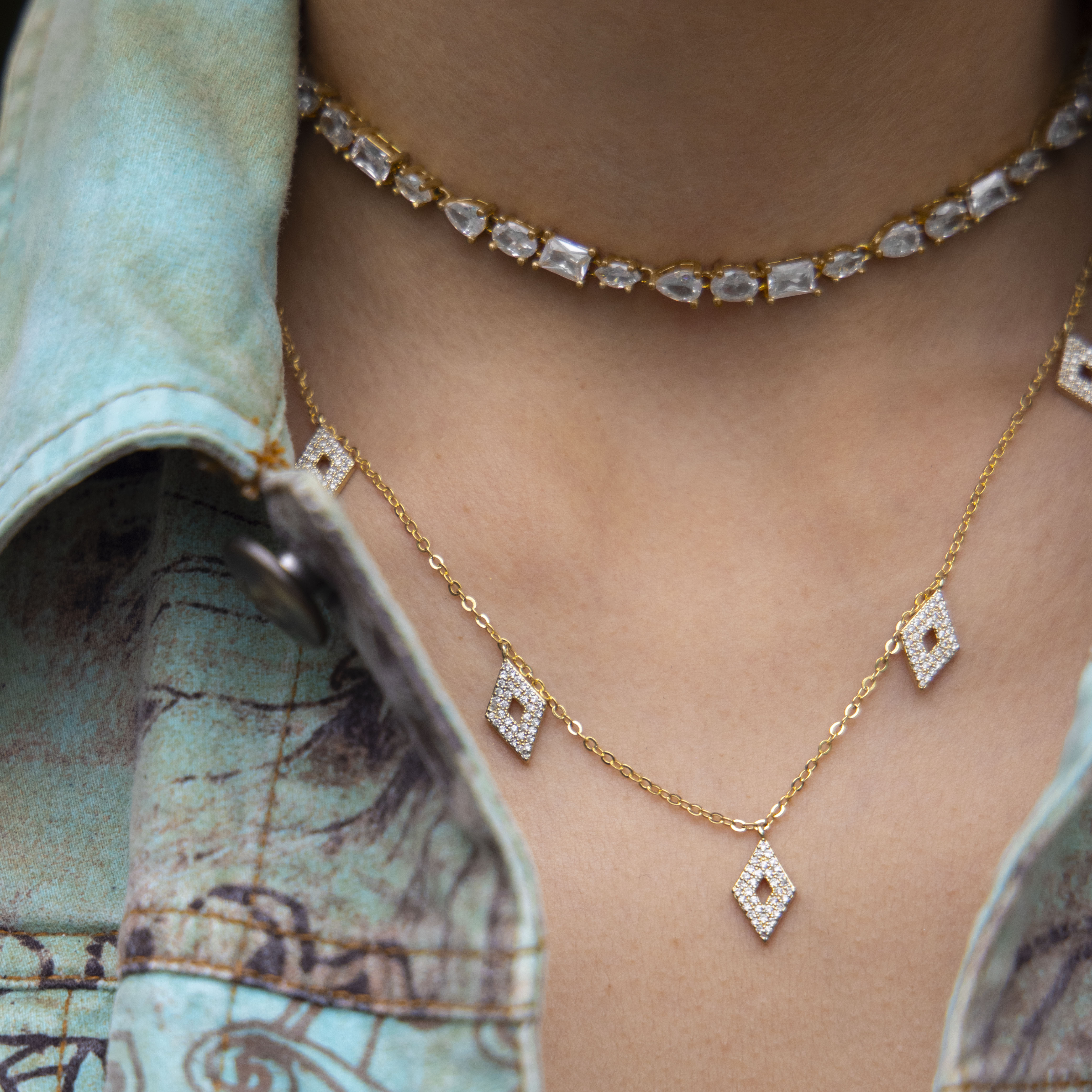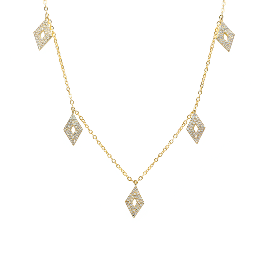 Este collar de Lavanda es una pieza de moda imprescindible. Con su chapa de oro de 14k y aleación de metales, cuenta con rombos de zirconias que le añaden un toque de brillo y sofisticación. Su diseño clásico y atractivo lo convierte en la elección perfecta para ocasiones formales y para darle un impulso a tu outfit.