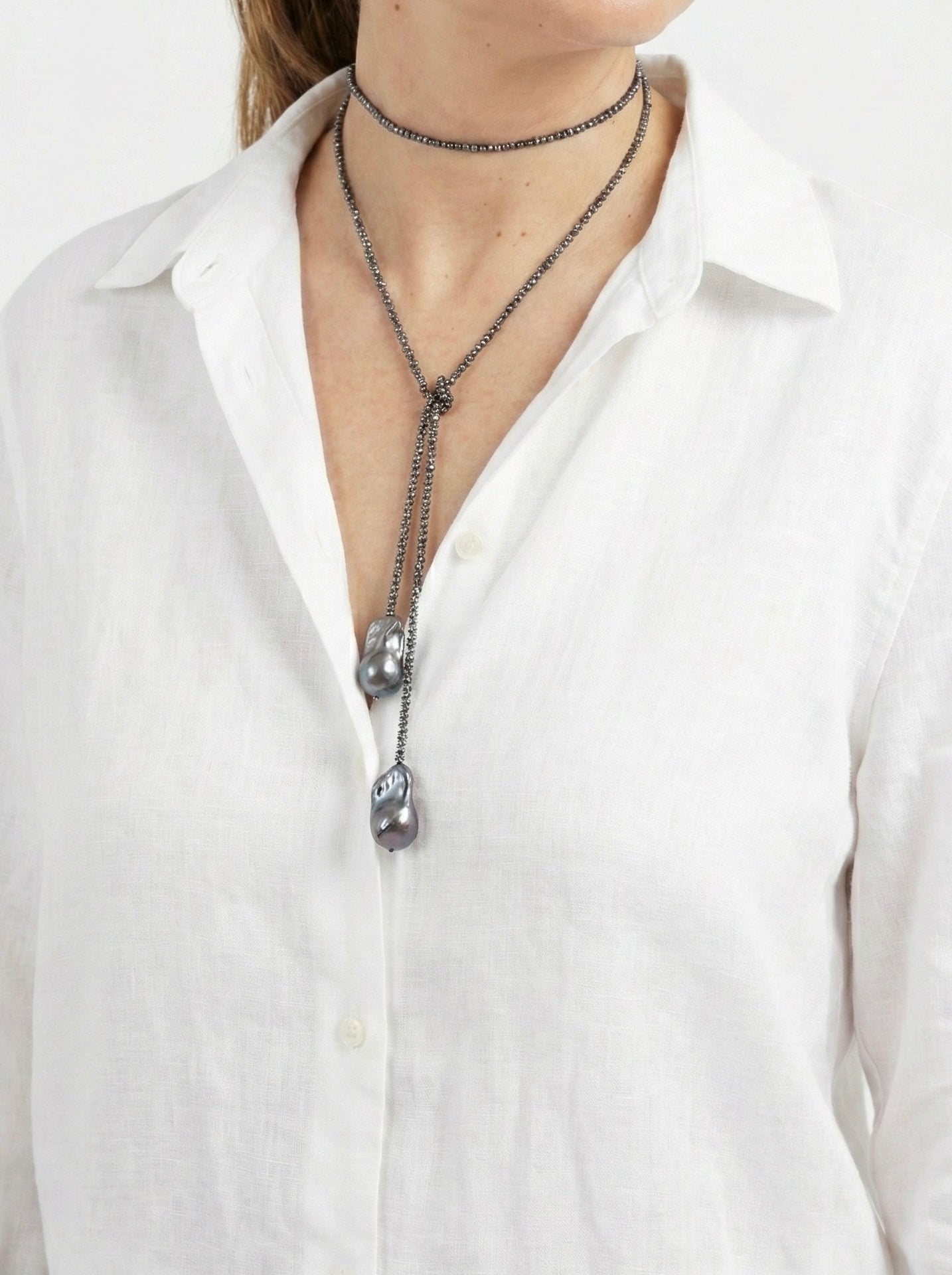 Luce sofisticada y moderna con nuestro Collar Corbatín de perlas gris oscuro. Elaborado con perlas naturales auténticas, este accesorio versátil combina elegancia clásica con un toque contemporáneo. Perfecto para elevar tu look diario o crear un estilo más formal, las perlas naturales añaden brillo y profundidad a cualquier outfit. Un detalle que susurra lujo sin gritar, porque la verdadera elegancia habla por sí sola.