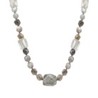 Elegante collar elaborado con labradoritas naturales en una armoniosa gama de tonos grises, ahumados y translúcidos. Sus cuentas combinan diferentes cortes facetados y pulidos que aportan brillo sutil y una textura única a la pieza.