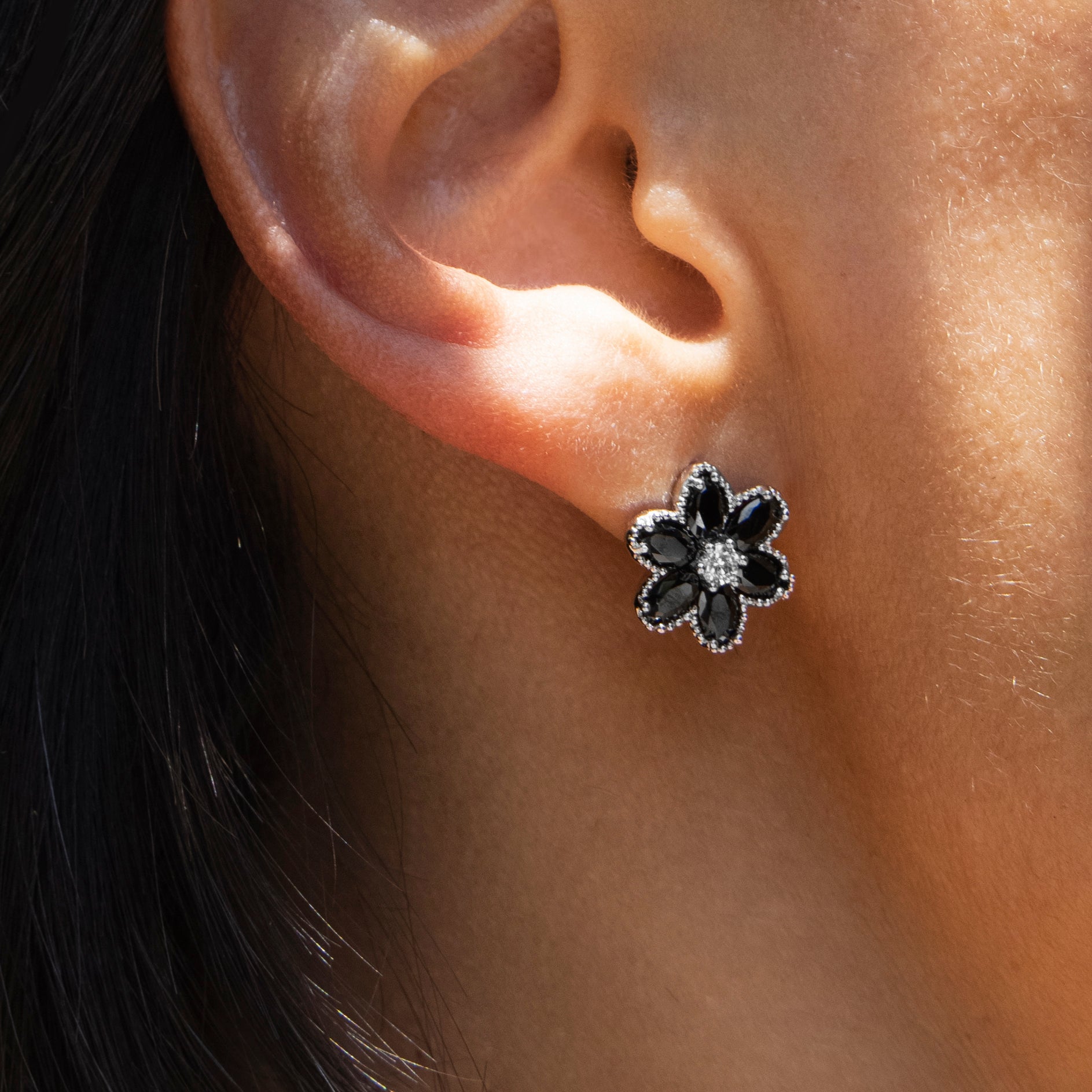 Los broqueles de flores en negro, fabricados en plata 925, son una elección elegante y distintiva. El negro agrega un toque de sofisticación y misterio, mientras que la plata 925 brinda brillo y durabilidad. Estos aretes son ideales para ocasiones especiales o para añadir un toque de estilo único a tu atuendo diario.