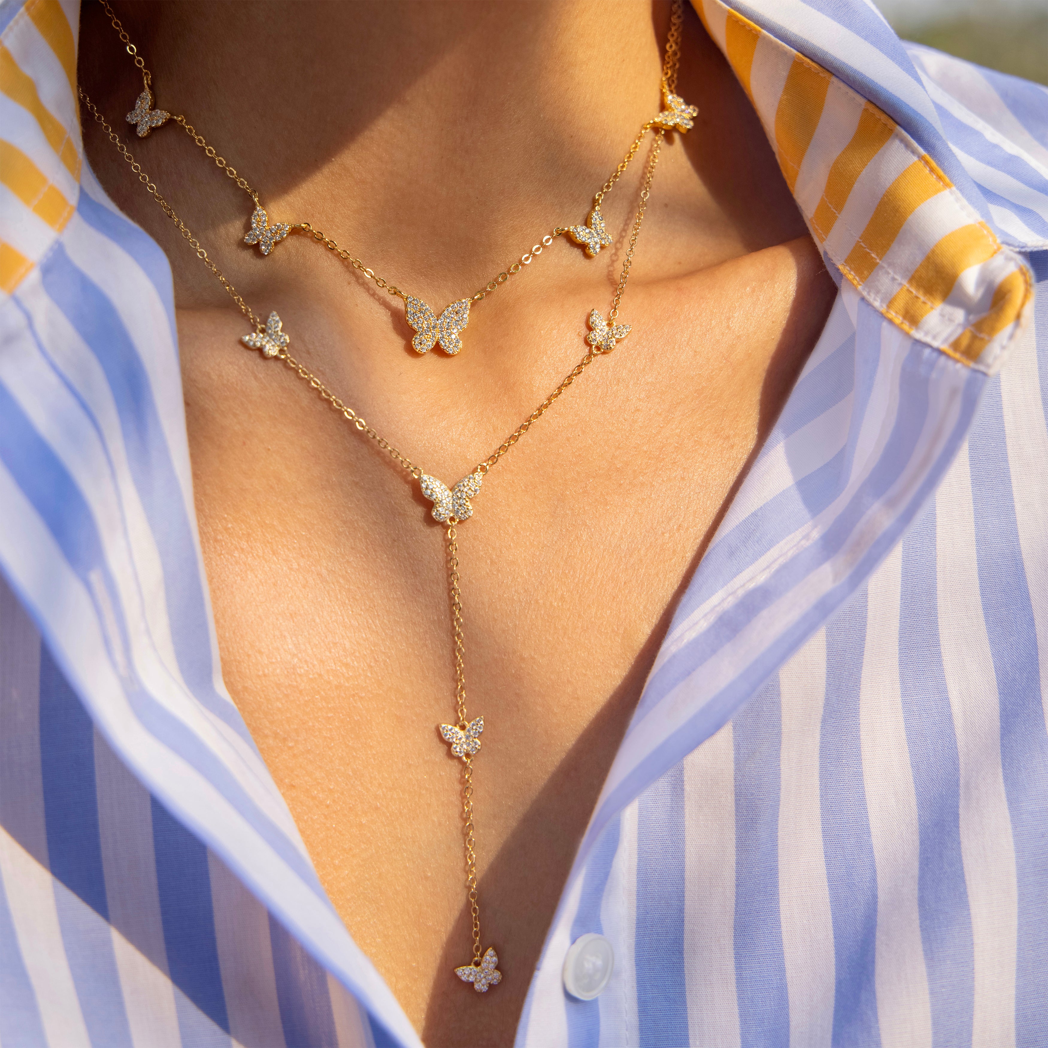 Descubre la elegancia con el collar de Lavanda, que presenta cinco mariposas doradas hechas de chapa de oro de 14k con zirconias. Este accesorio es elegante y llamativo, agregando un toque de glamour a tu look. El diseño de las mariposas le confiere un aspecto encantador y femenino, perfecto para realzar cualquier conjunto.
